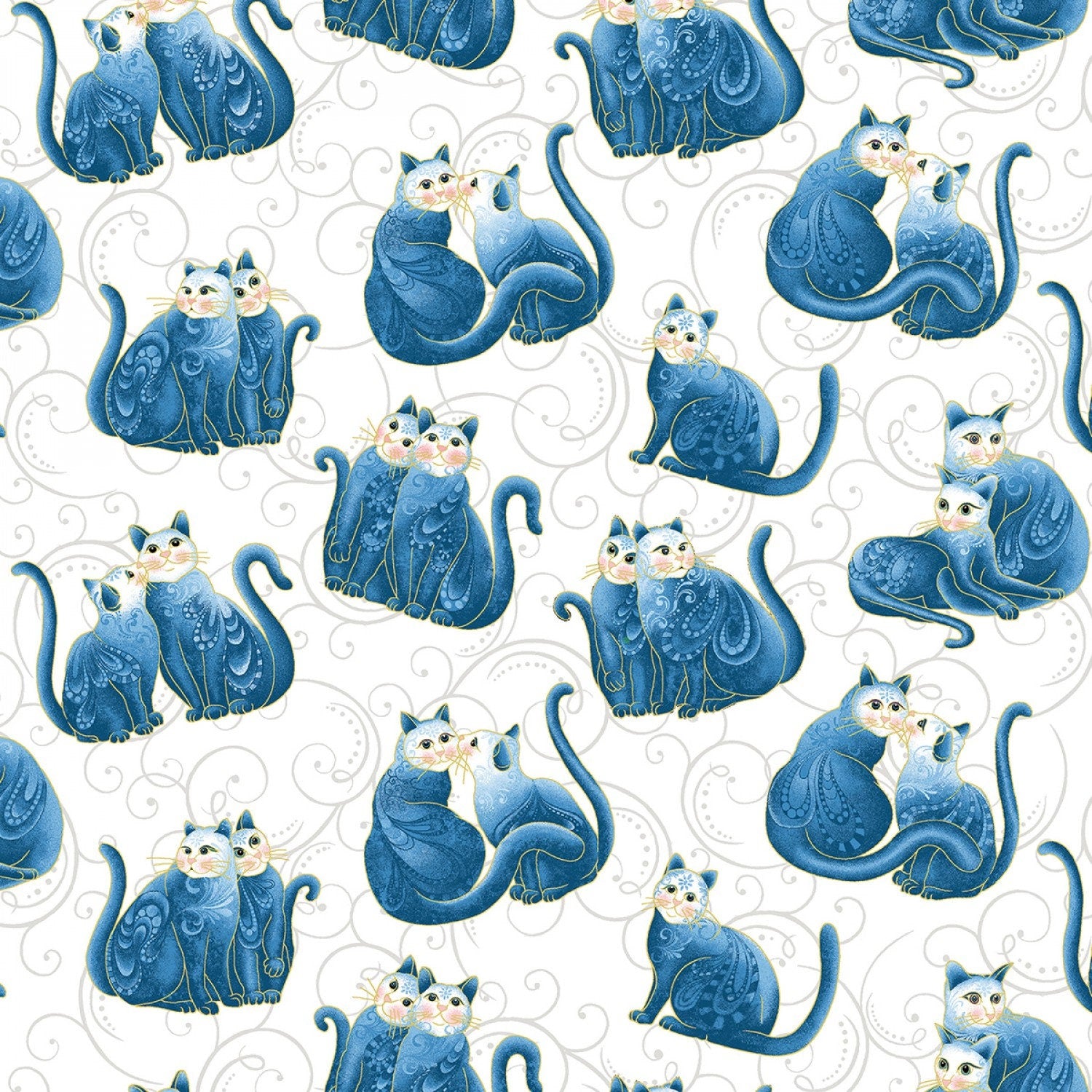 Cat-I-Tude 2 Purrfect Together by Ann Lauer Mini Scrolls Cats Blue Metallic 7558MB-56 Cotton Woven Fabric
