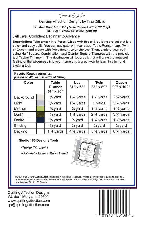 ake a walk in a Forest Glade with this skill-building project that is a quick and easy quilt. You can navigate with four sizes, Table Runner, Lap, Twin, or Queen, and create with five different color choices. Then, explore your path using Half-Square, Combination, and Quarter-Square Triangles with the precision tool Tucker Trimmer I. The destination will be a quilt that will bring the peaceful feeling of the wilderness into your home and a great way to learn this fun and exciting tool.