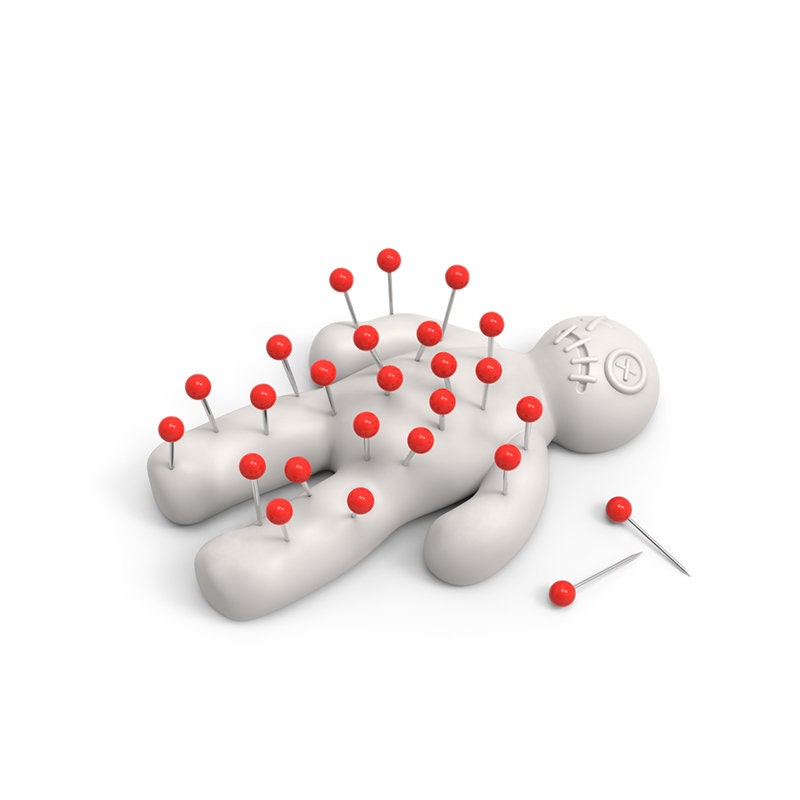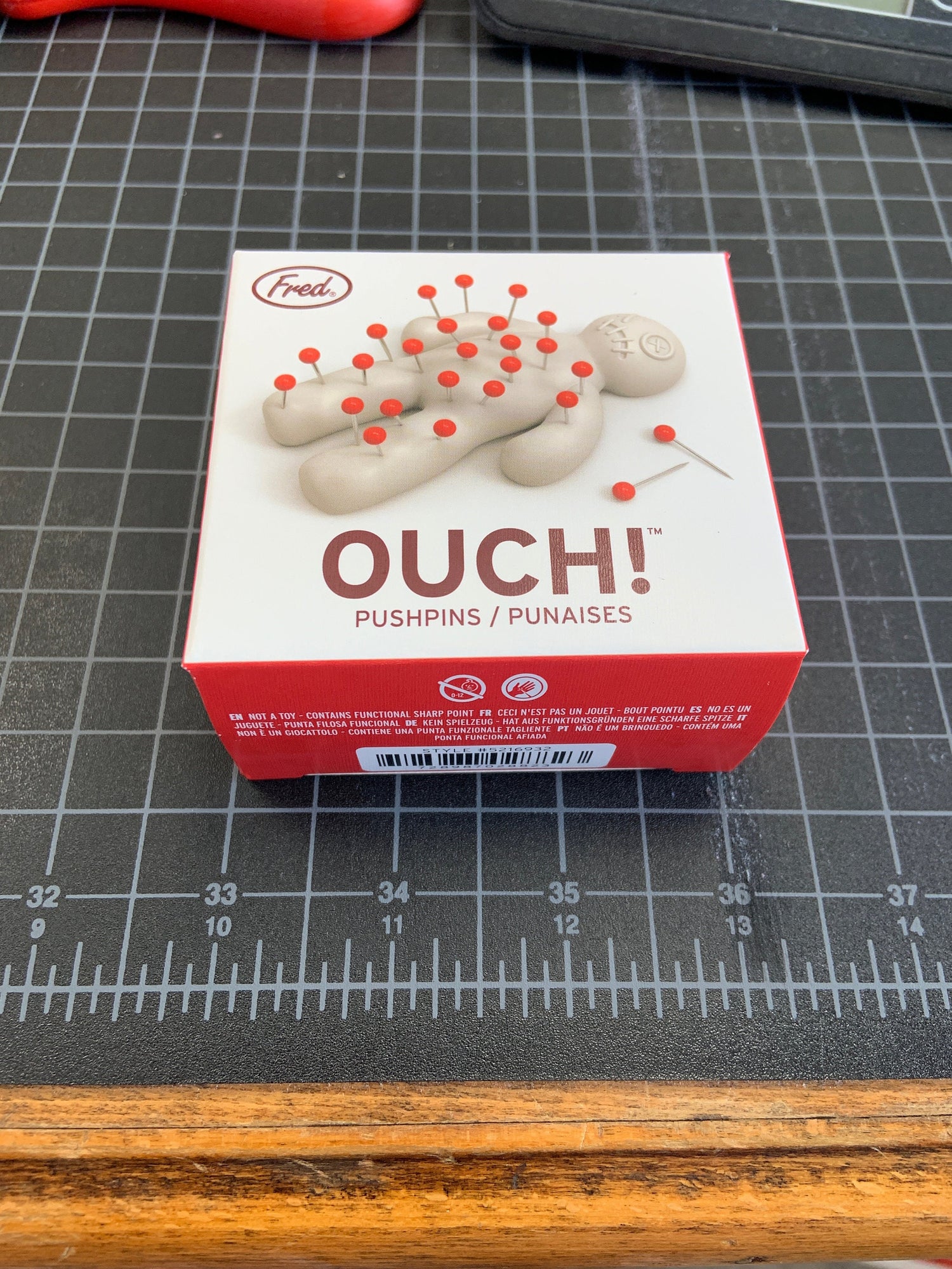 OUCH! Keep your stuff spellbound. Curses! All those little notes and clippings are getting out of control! Put a hex on that mess with Fred's OUCH! voodoo doll pin holder with 25 red-tipped pins ready to do your bidding. Makes a bewitching addition your desktop. Made of soft BPA-free TPR. Packaged in a box that measures approx. - 3" x 2.75" x 1.5"