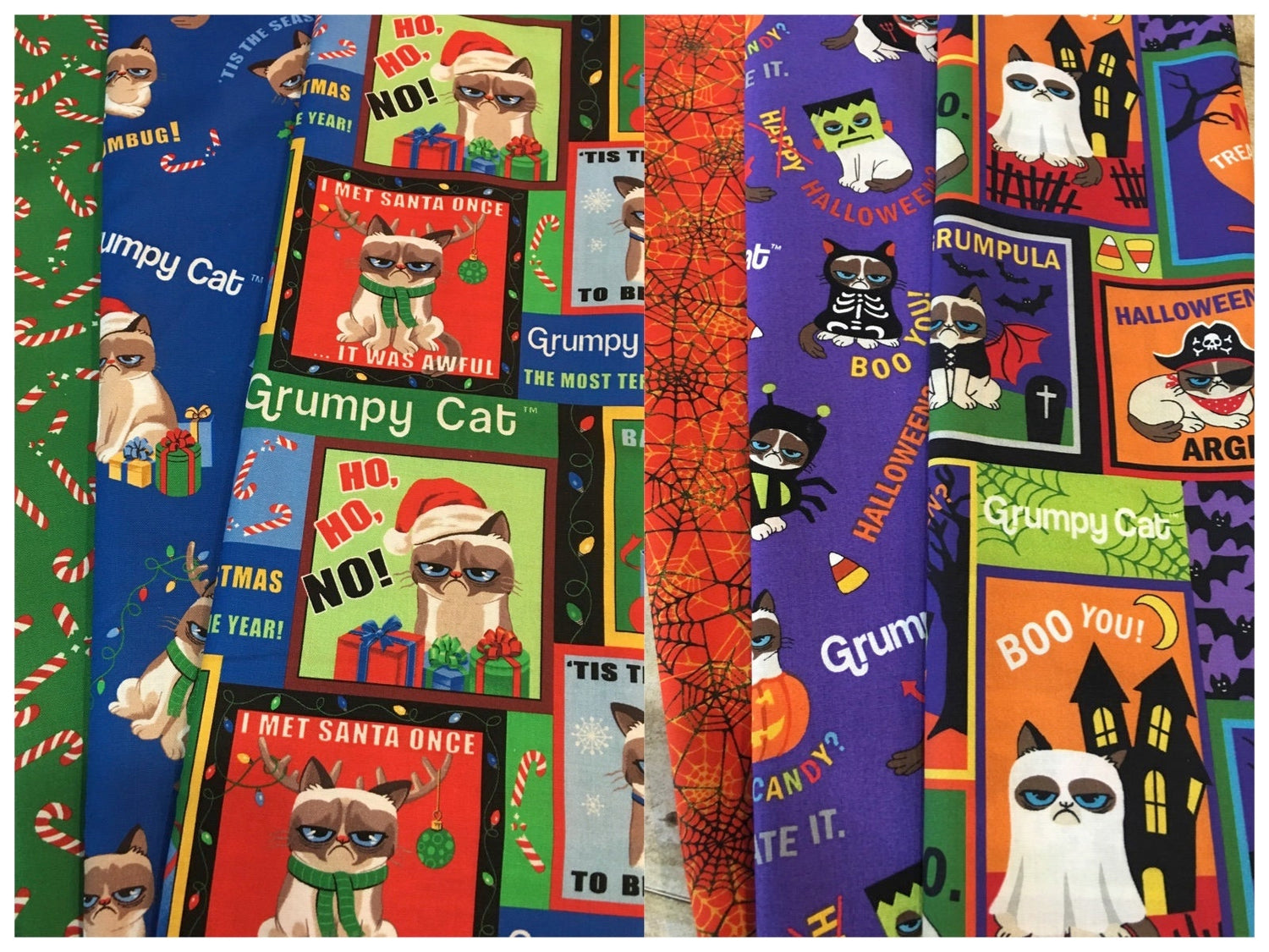 Grumpy Cat Holidays Broken Candy Canes on Green Cotton Woven Fabric
