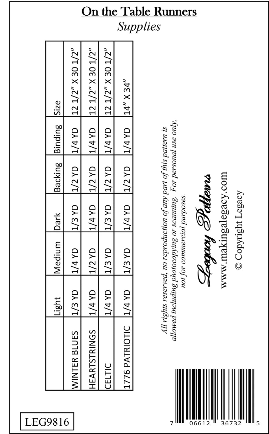 4 table runners designed to highlight seasonal fabrics. Winter Blues, Valentine Hearts, St Patrick's Celtic design, 4th of July Red, White and Blue Stars. Finished sixe appx 12in x 30in.