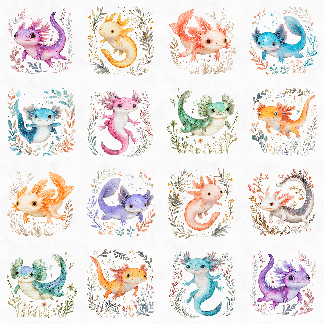 QT Cuties 2 17" Panel Axolotl Vignettes White (half shown) 31453Z Cotton Woven Panel