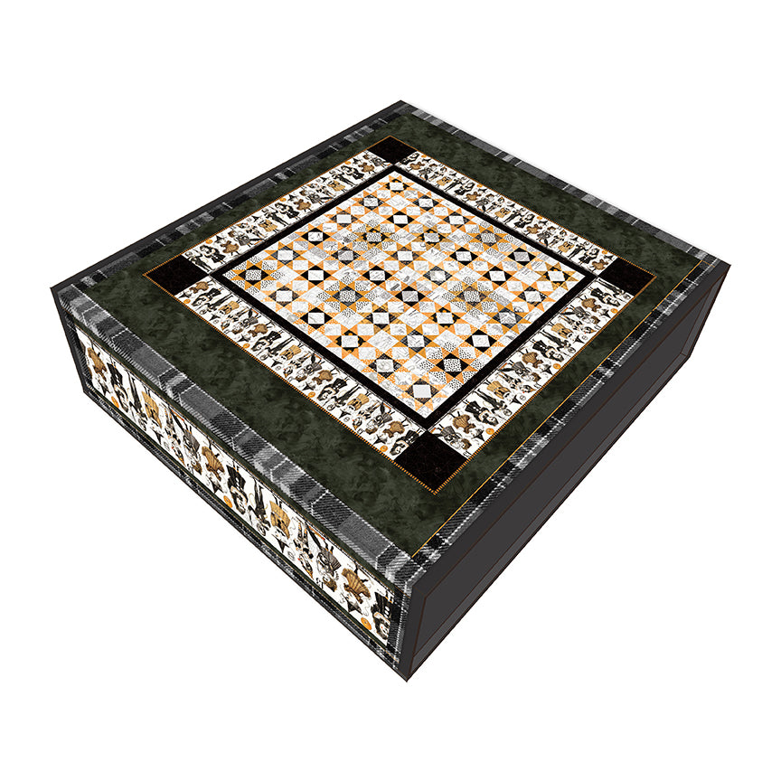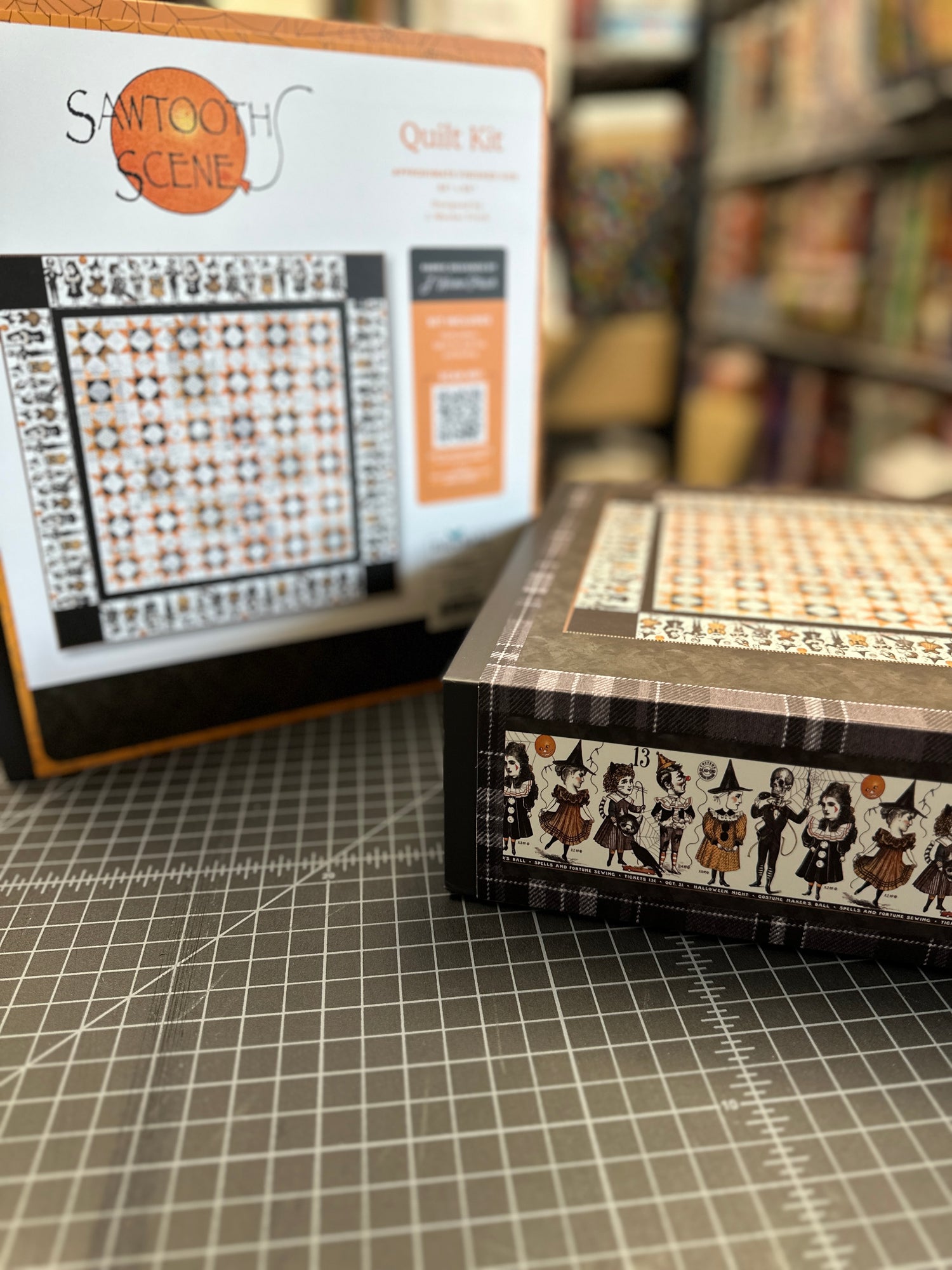 This is a Kit, not a finished project. The Sawtooth Scene Quilt Kit by J. Wecker Frisch of Great Joy Studio includes pattern and fabric for quilt top and binding. Finished size is 84" x 84". Kit comes in a solid box with a printed belly band label.